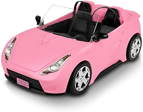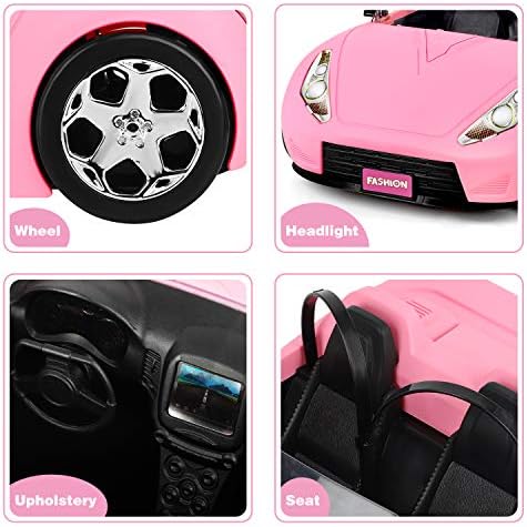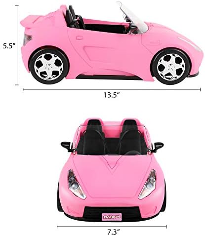 🌸TRENDY CAR FOR DOLLS: The lovely pink body, modern black interior, open roof, silvery rims and decals headlights make this convertible car pretty stylish. Push to start the fun!