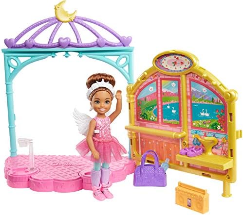 Chelsea and her friends inspire young minds to explore the world. Just like big sister Barbie, they love to try new things, challenge themselves and have fun -and inspire kids to do the same! Young imaginations can play out endless dance dreams with this Barbie Club Chelsea Ballet Playset. A cool transformation feature lets kids take Chelsea doll from ballet class to a recital in seconds, and themed accessories spark endless storytelling. When the stage is opened up, a scenic view and shelving set the scene for ballet class. Help Chelsea doll warm up on the ballet barre, then head over to her dressing table where she can get ready for the spotlight! A plug-and-play design holds a water bottle in place while kids dress her in her tiara, tutu and Swan Lake-themed accessories. When it's showtime, transform the practice space into a performance stage with a sweet backdrop for the recital. Clip Chelsea doll to the stage and activate the twirling feature to see her pirouette -there's even a second clip for a friend (other dolls sold separately). Additional pieces bring stories to life -there's a boombox, ballet bag, costume rack with a hanger, leg warmers, a pair of casual shoes for warmups and a pair of pointe shoes for the performance. Dreamers aged 3 to 7 years old can bring ballet dreams to life with this Chelsea playset. It's so much fun to imagine all the possibilities because you can be anything with Barbie! Kids can collect more Chelsea dolls and toys too add more friends and inspiration to playtime. Each sold separately, subject to availability. Doll cannot stand alone. Colors and decorations may vary.