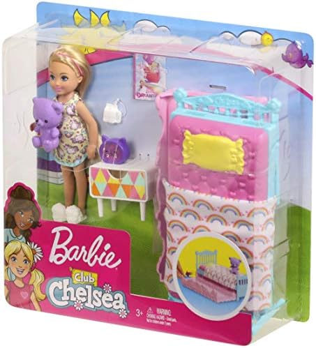Chelsea doll and her friends inspire young minds to explore the world -just like big sister Barbie, they love to try new things, challenge themselves and have fun. Kids can play out so many stories with Chelsea doll and toys, like this Club Chelsea doll and playset. It delivers sweet dreams with a sweet bedroom theme. Inspired by the animated series Barbie Dreamtopia, the pink and blue trundle bed really works -simply slide out the lower bed to make room for Chelsea doll and her purple teddy bear, then tuck her in with her pillow and rainbow-print blanket -it matches the rainbows that decorate her bed! A nightstand with colorful graphic is the perfect place for her kitty-shaped clock, and a working drawer holds her bedtime reading. Trouble sleeping Try some milk; it's even got a straw! Chelsea doll is ready for bed wearing a nightshirt with rainbow print and white slippers with furry detail. So many fun pieces encourage imaginations to play out unlimited stories with Chelsea dolls and toys. Collect them all to inspire even more storytelling fun (each sold separately, subject to availability) Includes Chelsea small doll wearing fashion and accessories, teddy bear, large working trundle bed, nightstand, clock, milk and magazine. Colors and decorations may vary.