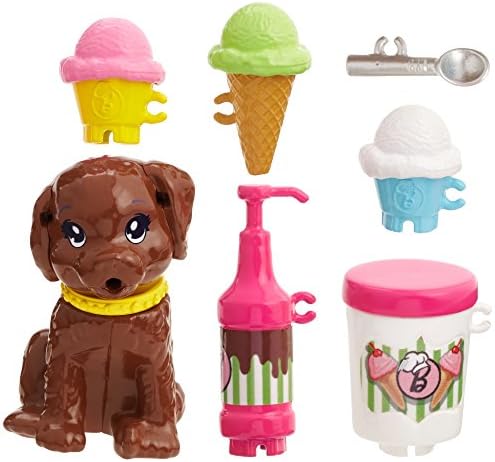 Launch play and career exploration with Barbie play sets that let her younger sisters explore their dreams, too -and bring their pets along for the company! Skipper doll can delight friends with ice cream treats and has all the ingredients to launch her own business, including a silent partner -her puppy. Her supplies include a gallon of ice cream, a bottle of chocolate sauce and a scooper, all with handles that fit on her hand. Three ice cream cones offer different "flavor" options. Skipper doll can serve up fun wearing a top with "cool" graphic, a teal skirt, a red and white apron with colorful ice cream cone print and pink sneakers. Her puppy is ready to dig in with a sweet look, dynamic pose and yellow painted collar. Young imaginations will have so much fun cooking up stories and playing out their own dreams. Collect all of the Barbie dolls and accessories to explore even more possibilities because with Barbie, you can be anything! Includes Skipper doll wearing fashions and accessories, puppy figure and themed accessories. Doll cannot stand alone. Colors and decorations may vary.