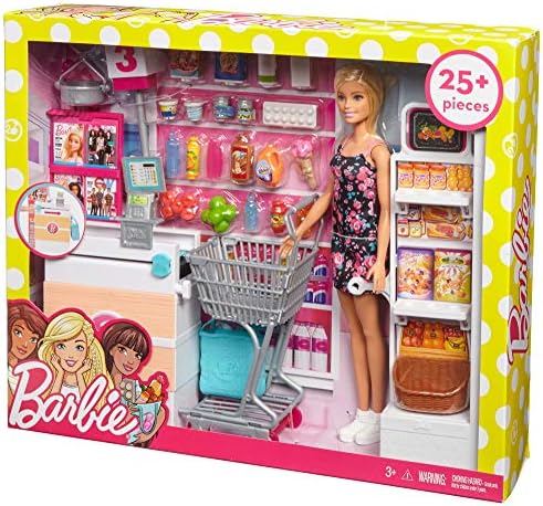 Take Barbie doll on a run to the grocery store with this supermarket playset that has all of the ingredients for fun, more than 25 pieces total: Barbie doll comes with a checkout stand with register and working conveyor belt, display stand, rolling shopping cart and food accessories to stock the shelves.