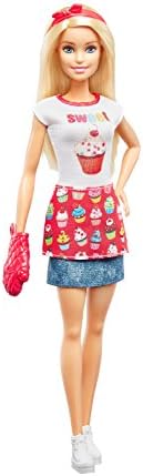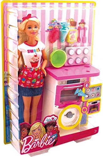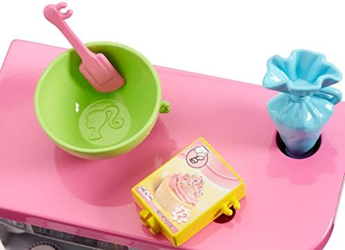 Barbie bakery chef doll is ready to bake with an oven play set and food accessories that really rise! An oven sound, rising action and color-change "icing" provide the ingredients for fun with easy-to-use mechanisms. Lots of colorful pieces inspire all kinds of stories. Plus, Barbie has partnered with Tynker, the game-based platform that teaches kids how to code -discover how sweet coding can be when used to decorate beautiful pastries. Barbie doll's oven has signature style designed in pink and white with plug-and-play pockets to hold accessories in place as young chefs play out mixing and pouring. Then, they can place the pound cake or the cupcake pan into the oven and turn its timer -the oven dings and the baked good inside pops up out of its pan. It's so cool! For even more dessert delight, dip the piping bag's tip into water and apply to the tops of the cupcakes -they change colors to reveal cool icing decorations! Young foodies can play out so many stories in this cool kitchen that also comes with a mixing bowl and spoon, a box of cake mix, a spatula and an oven mitt. Barbie doll's look serves up fun, too -she wears a shirt with a "sweet" cupcake decal, a denim skirt and a trendy pair of white sneakers; a cupcake-decorated apron and red headband with bow are extra-sweet touches. With so many fun features and pieces, this baking play set offers all-day play and a world of exploration because with Barbie, you can be anything! Includes Barbie doll wearing bakery chef fashion and accessories, oven with working features, "rising" pound cake, "rising" and color-change pan of cupcakes and themed pieces. Doll cannot stand alone. Colors and decorations may vary.