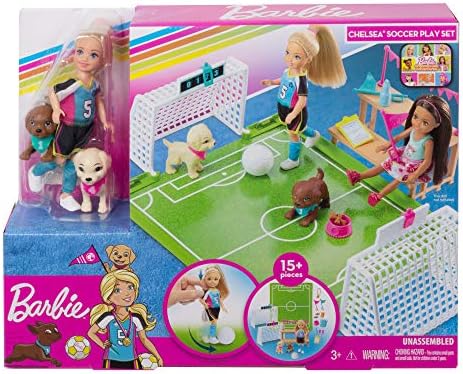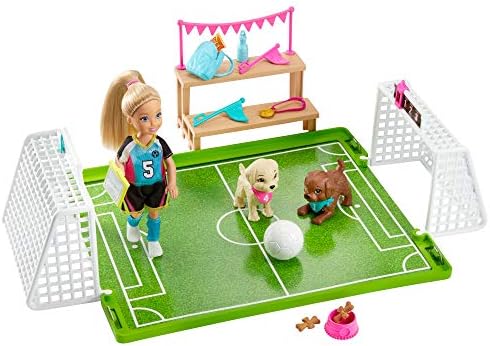 Spark storytelling and sports-play with Barbie dolls inspired by Barbie Dreamhouse Adventures! Young imaginations can play out so many sweet stories with Chelsea and her soccer playset. Two goals, each with an adjustable scoring board, attach to a play area where she can practice and play -press down on her shoulders for "kicking" action! A set of bleachers provides seating for Chelsea doll's friends (not included) to watch and cheer her on. In a colorful soccer jersey, shorts, shin guards and shoes, Chelsea doll is ready to hit the field with her two puppy friends. With so many themed play pieces, like a ball, flags, gold medal, puppy snacks, water bottle and backpack, the storytelling possibilities are endless! With dolls inspired by Barbie Dreamhouse Adventures, imaginations can peek into the everyday lives of Barbie, her sisters and their friends as they embark on exciting adventures together. Aspiring athletes will love exploring sports stories with Chelsea and her soccer playset because when a girl plays with Barbie and her sisters, she imagines everything she can become! Collect all the Barbie Dreamhouse Adventures dolls and toys to recreate favorite moments or dream up adventures of your own. Each sold separately, subject to availability. Doll cannot stand alone. Colors and decorations may vary.