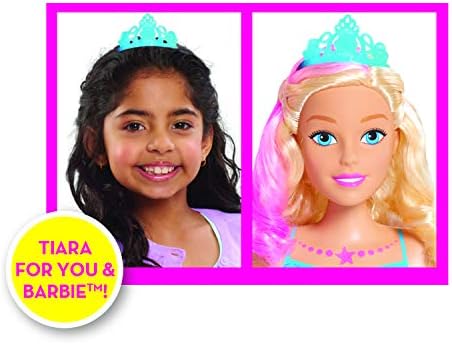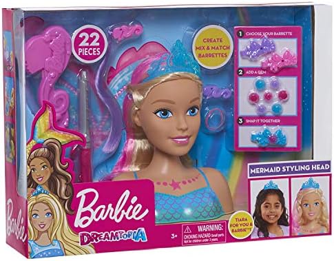 The Barbie Dreamtopia styling head is full of fantastical styling fun! Barbie’s thick flowing blonde and pink locks are perfect for curling and braiding into trendy designs! Use the hair ties and cute brush to give Barbie a whimsical up-do. Add some flair to her fabulous hair with customizable hair clips and barrettes. Then top off the look with her fancy tiara! With your little stylist’s help, Barbie will be the dreamiest girl in town! Full set includes: one Barbie styling head, one wear & share tiara, one hair curler, one brush, five customizable hair clips and barrettes, eight pop-in gems, and hair ties. Ages 3+