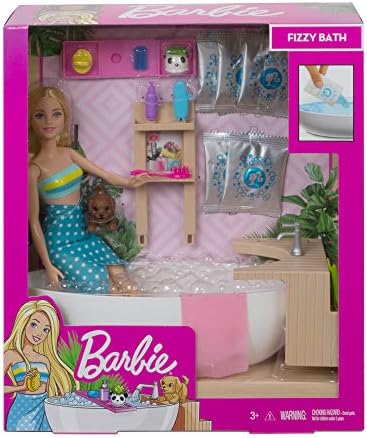 the set includes barbie doll wearing a swimsuit, her puppy, a bathtub, a spa frame, 5 packs of fizzy powder and accessories to help play out a relaxing bath.