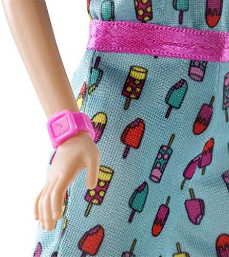 Barbie wears a turquoise jumpsuit with a colourful ice print and pink ruffles, white trainers, a pink watch and a pink helmet.