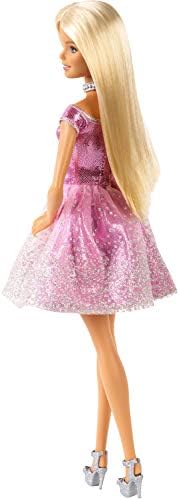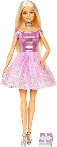 Barbie doll is ready to deliver a message of Happy Birthday! She comes inside a package with space to show who it's for and who it's from. Once delivered, kids can unbox her and make her a guest at the party! She's dressed in a sparkling, shimmery, pink party dress accessorized with a silvery necklace and strappy pair of shoes -plus, she has a gift of her own to present to the birthday honoree. Kids will love celebrating their special day with a special Barbie doll because when a girl plays with Barbie, she imagines everything she can become! Doll cannot stand alone. Colors and decorations may vary.