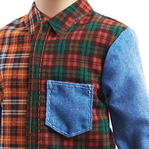 Ken doll is more slender than the original body and wears a mixed plaid and denim shirt with black denim pants.