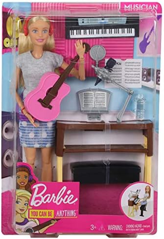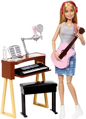 Barbie doll is ready to write, record and perform music with a play set that hits all the right notes. Barbie musician doll comes with two favorite instruments, a guitar and a keyboard, plus other accessories, to spark imaginations. She has fully articulated arms and legs in order to hold the guitar and sit on the keyboard bench! The pink guitar has a detachable strap for practice or performance. The wood-inspired keyboard stand features a pull-out shelf for the keyboard. Its top shelf has a stand for the music sheet and a stand that holds two microphones: a recording-style microphone and a microphone with a pop filter, which helps musicians filter noise. A cool black bench lets Barbie doll sit and provides a place to store the music sheet with a realistic removable lid. Barbie doll is ready to rise to the top of the charts wearing a gray top, a graphic blue skirt and white tennis shoes. Pink headphones, a water bottle and sheet music add additional storytelling play. Plus, Barbie has partnered with Tynker, the game-based platform that teaches kids how to code -discover how to use programming to create songs and music videos. Young musicians will love the many different ways to create, perform and dream with this music play set because with Barbie, you can be anything! Includes Barbie doll wearing fashion and accessories, guitar with strap, keyboard, keyboard stand and themed accessories. Doll cannot stand alone. Colors and decorations may vary.