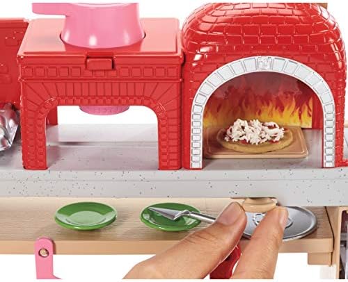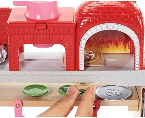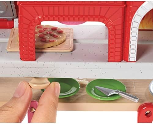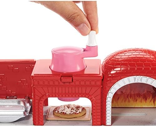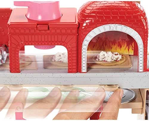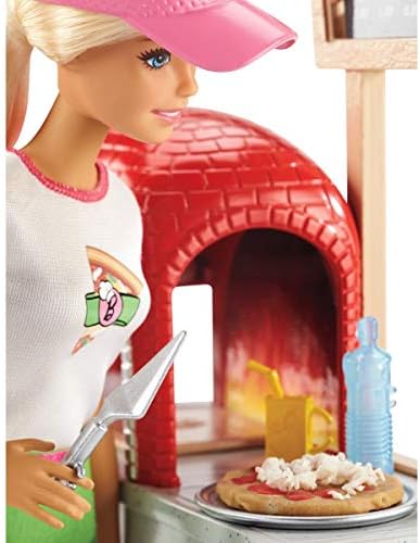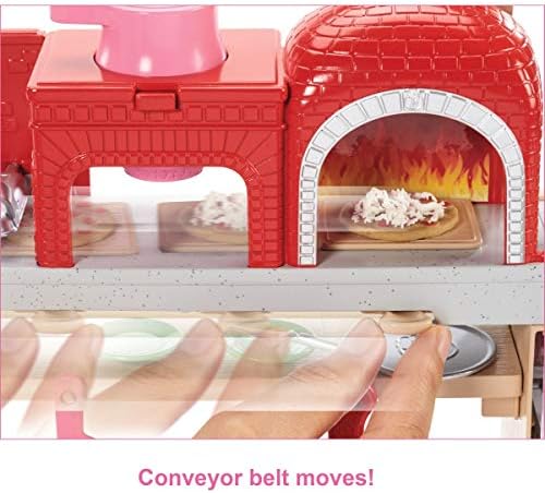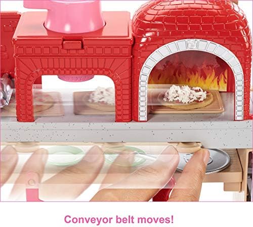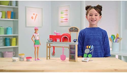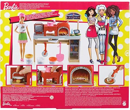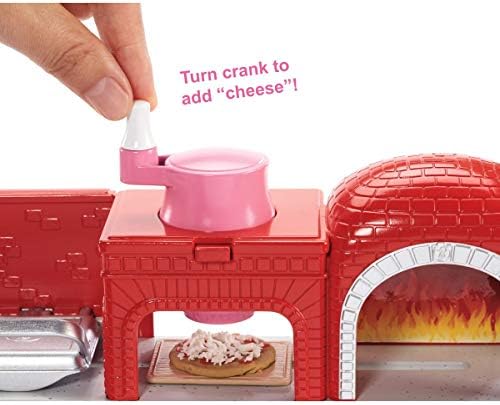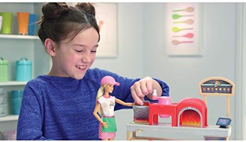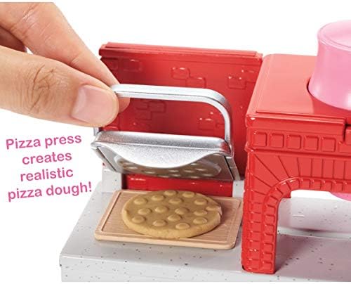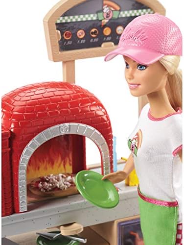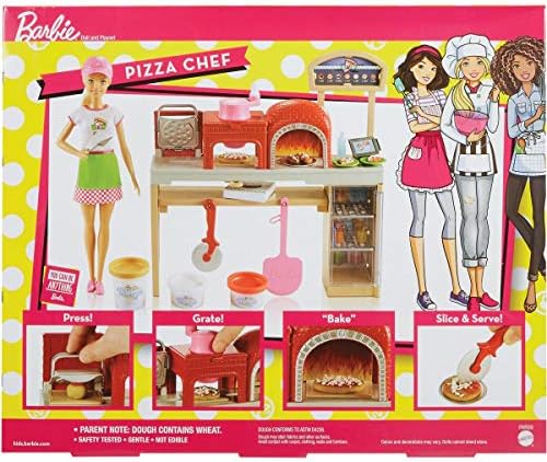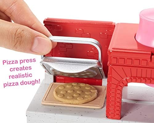 Barbie pizza chef doll is ready to cook up fun with a pizza shop play set, three colors of dough and accessories that let kids make their own doll-sized pizzas! Young foodies can press the dough, add "sauce" and "cheese," then slice and serve -once they've collected payment at the register, of course! A sliding conveyor belt keeps the food and imaginations moving on this pizza maker. Start with the beige dough and the tomato-colored dough: use the pizza press to flatten a pizza crust and sauce on the conveyor pan. Slide the belt lever and the pizza along until it rests under the cheese grater. Add "cheese" using the white dough: press into the shredder and once the grater is locked into position, turn the hand crank to sprinkle the topping onto the pizza. Then move the lever again and slide the pizza into the oven with its fiery backdrop. When you think it's done, use the pizza slider to move the pizza onto its pan and cut it up with the pizza slicer. Serve a slice up on a plate (there are two) or place it in the pizza box for take-out. Three drink selections -that fit on Barbie doll's hand -are extra-fun ingredients for play. Store leftovers in the mini fridge below the counter; a shelf under the belt adds additional storage space. Barbie pizza chef doll is ready to serve up her best pizza wearing a pizza-themed white top, a pink and white checked skirt, a green apron, pink shoes and a pink cap. With so many fun features and pieces, this pizza shop play set offers all-day play and a world of exploration because with Barbie, you can be anything! Includes Barbie doll wearing pizza chef fashion and accessories, pizza shop with stations and working features, three colors of dough and themed pieces that include utensils and a register. Doll cannot stand alone. Colors and decorations may vary.