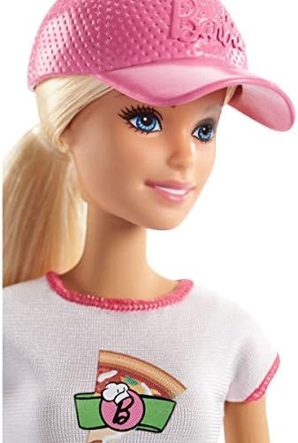 ​Play out all kinds of stories with Barbie doll dressed as a pizza chef with a pizza decal on her shirt and a classic pink and white check print on her skirt. A pair of pink shoes, a pink cap and a green apron complete the look.