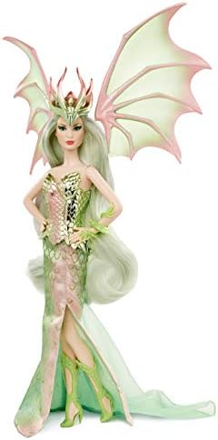 Behold the third and final doll to enchant the Barbie Mythical Muse Series. Dragon Empress Barbie doll is a bold, statuesque beauty with a dramatic wingspan. She wears a scale-detailed bodice in metallic mint-green and pink ombre. Beneath it is a glittered, scale-printed skirt with a slit that reveals her pearlescent, heroic heels. Her headpiece, in matching pastel ombre hues, crowns her cascading fantastical hair. A dragon-inspired cuff coils her arm, completing the look. Poised to take flight to a distant land, Dragon Empress Barbie doll makes the perfect gift for collectors and fantasy lovers. Includes doll stand and Certificate of Authenticity. Gold Label Collection. Doll cannot stand alone. Colors and decorations may vary.