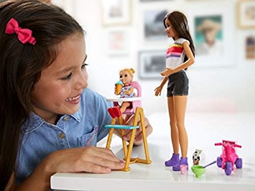 Barbie Skipper Babysitters Inc. dolls and playsets let kids explore their nurturing side as the babysitter. Each comes with a Skipper or friend doll, a baby or toddler doll and furniture and accessories matched to classic childhood moments. This feeding-themed set has all the ingredients for playtime fun with a toddler doll that kids can help to feed herself! Simply seat the small doll in the high chair and place the cup, spoon or ice cream cone in her hand -handles let her hold the items. Then move the lever in her back through the hole in the high chair to move her arm up and down to lift the treat to her mouth -mmmmm! When feeding time is over, place her on her tricycle and push to help her ride and work up an appetite. Skipper doll is ready to babysit wearing a casual outfit with stiped t-shirt, black shorts and purple sneakers. With so many pieces to inspire storytelling, there are endless babysitting adventures to imagine and reimagine. Kids will love being the babysitter and caring for others with this playset that inspires nurturing play! Collect the Babysitters Inc. dolls and accessories to fill a babysitting schedule full of fun (each sold separately, subject to availability). Includes Skipper babysitter doll wearing fashions and shoes, small toddler doll wearing fashion and shoes, high chair, tricycle and food-themed pieces. Skipper doll cannot stand alone. Colors and decorations may vary.
