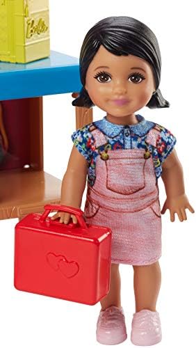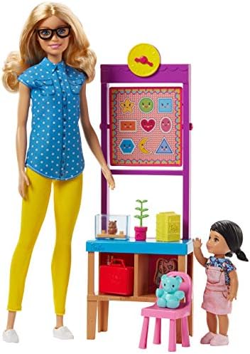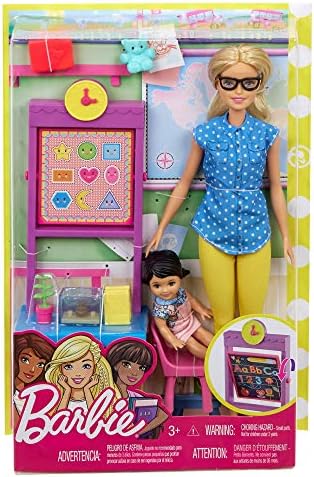 Barbie career dolls and playsets inspire kids to dream big and aim high! This teacher-inspired Barbie playset turns work-time into playtime with Barbie doll, a piece of classroom-related furniture and accessories that let young professionals explore their dream careers. The Barbie teacher playset also includes a student figure for even more storytelling possibilities. A cool working feature adds realistic role-play and all-day fun: the set's blackboard flips to display a different lesson. The desk below has shelving for storage and a chair for the student to sit. Accessories include a hamster in its terrarium, a plant and a set of books; pieces for recess include a teddy bear and lunchbox. Barbie teacher doll wears a career-themed outfit professionally styled with yellow pants, a polka-dot shirt, white shoes and black eyeglasses. Kids will love leading class, learning lessons and exploring their dreams. Pick one profession or try them all because with Barbie, you can be anything (each sold separately, subject to availability). Includes Barbie teacher doll wearing career-themed outfit and accessories, a student doll, a classroom piece with desk and flipping blackboard, a pink chair and themed accessories. Barbie doll cannot stand alone. Colors and decorations may vary.