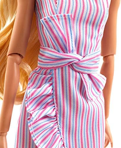 Barbie doll is baby shower-ready in a wrap dress with ruffled details and sweet stripes, strappy pink shoes and classic white hoop earrings.