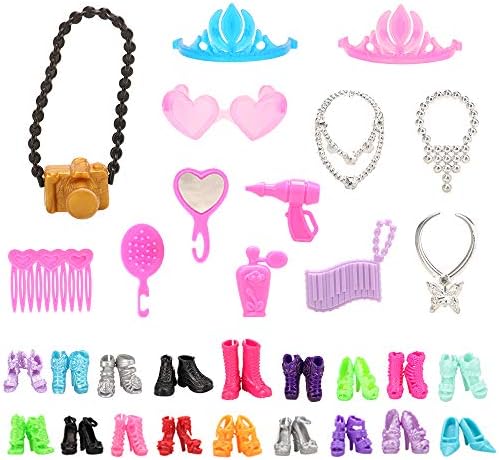 We had many accessories of girl doll shoes, camera crown, necklace, comn, bag, glasses.