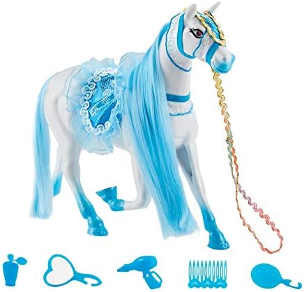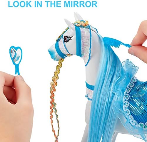 Package Includes -- White horse with blue hair, mirror, comb, brush, perfume, haridryer