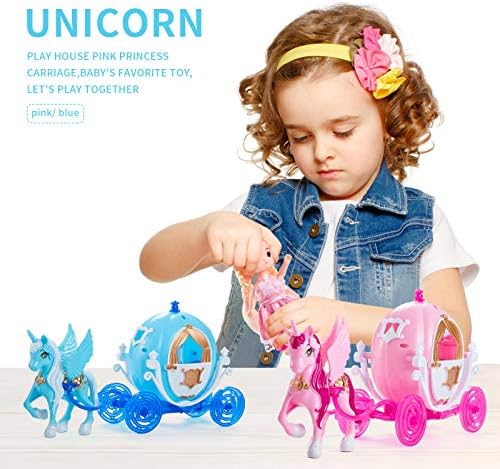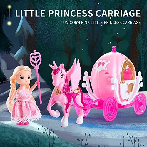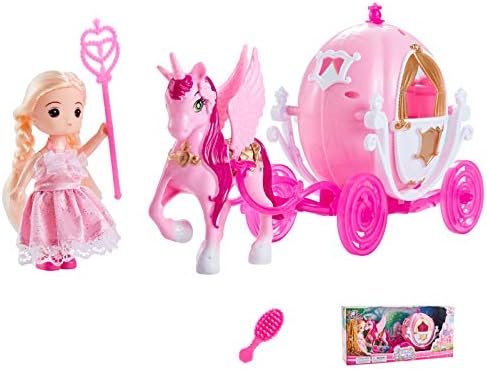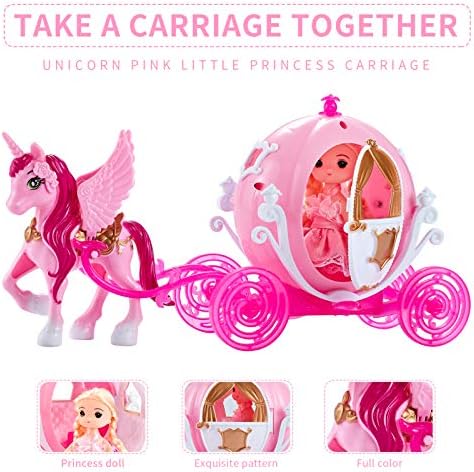 This is the small sister little princess of the forest land magic world. She rides on her Pumpkin unicorn carriage. Her story need you to keep continue Specifics: Size: Doll: 5" tall, unicorn: 5.5" long and 5.5" tall, carriage: 8.7" long Material: plastic Package Includes: 1x unicorn, 1x doll, 1x pumpkin carriage, 1x brush, 1x fairy stick. Features: Link Up the Unicorn and the Carriage. The carriage can be linked up to the unicorn. Or they can be detached as isolated unit 5” Princess Doll All 5” fashion dressings are suitable for this doll. . The Carriage The wheels of the carriage can roll. The window and the door of the carriage can be opened. The doll can sit in the carriage The Unicorn Doll The wings can be detached from the unicorn. Brushable Hair of the Princess Dolls You can design the hair style as you like according to your imagination. Open-ended Play “According to research, open-ended play is one of the most important ways to ignite children’s imaginations and maintain their creativity into adulthood”. This unicorn carriage and doll set brings fun to your children and develop their imagination while playing. To Tell Fair Tale Stories Parents can tell fairy tale stories with this playset. All girls kids like fairy tales. With this set of unicorn horse carriage and princess doll, to bring joy and playtime for you and your kids. Great Gift This fly horse carriage and princess doll playset is the best gift for your daughters as birthdays, Christmas gift and more!