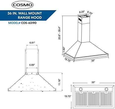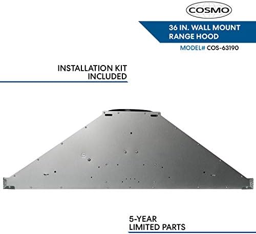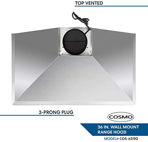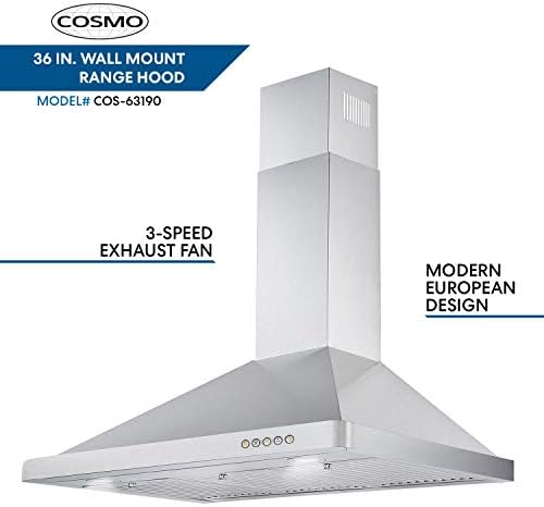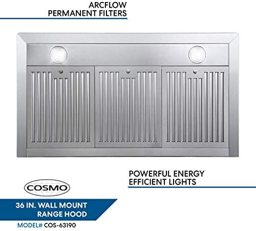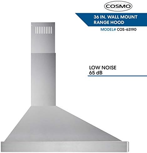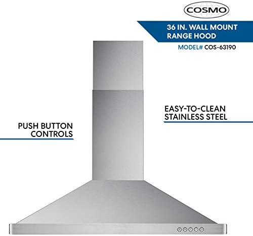 EFFICIENT AIRFLOW: Featuring 36-inch size, 380 CFM and push-button controls, Cosmo’s wall mount range hood quickly ventilates your kitchen without the noise of competing range hoods. Optional Carbon Filter Kit available for ductless (Purchase Part # CFK1-TM)