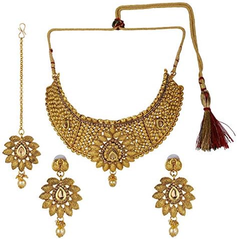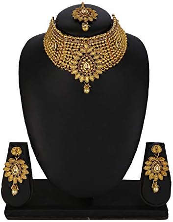 Efulgenz Indian Bollywood Traditional 14 K Gold Plated Kundan Pearl Wedding Choker Necklace Earrings Maangtikka Jewelry Set