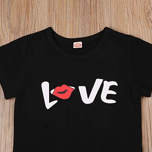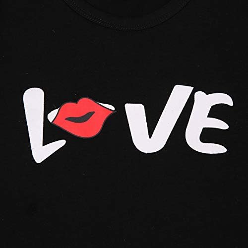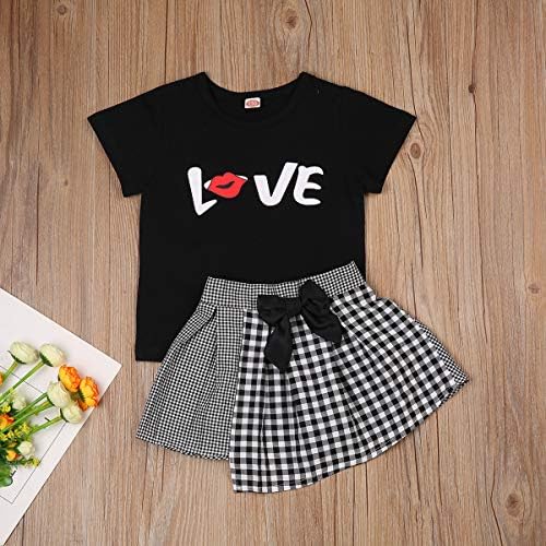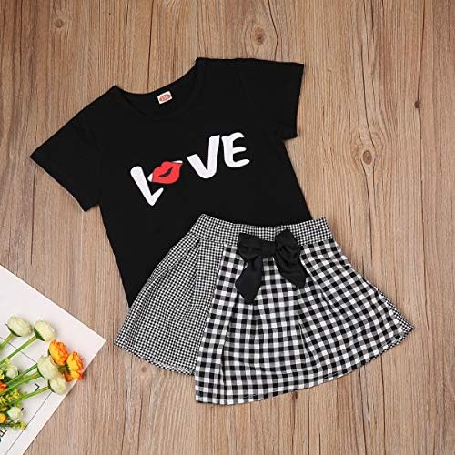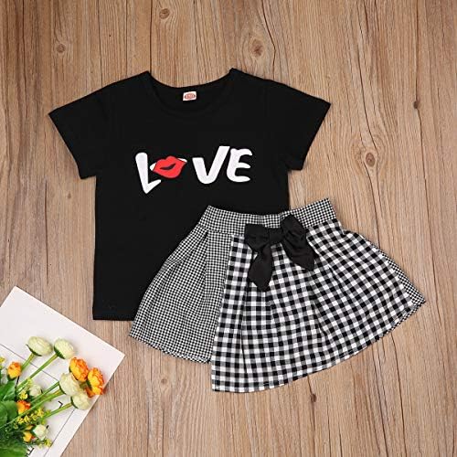 ➢ DESIGN - LOVE and lips print top, short sleeve black tee shirt, elastic waist skirt, irregular plaid checked mini skirt with black bowknot design