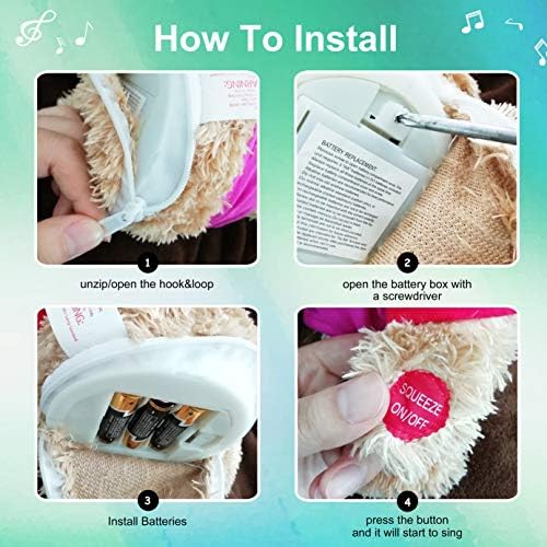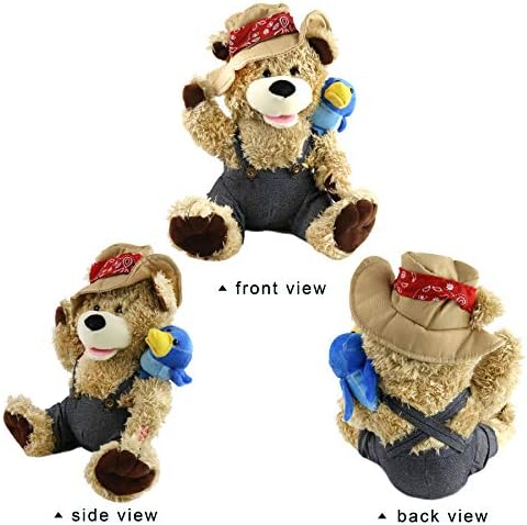 2. EASY TO USE: Unzip the bottom of the cowboy teddy bear, and open the batteries box with a screwdriver. Put in 3 AA batteries (NOT INCLUDED), and then reassemble it. Ask your kid or friend to press on the left hand( the side the bird stays), then this electronic plush toy will start to perform.