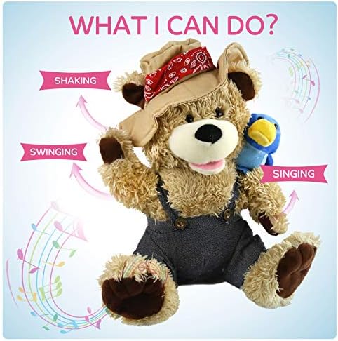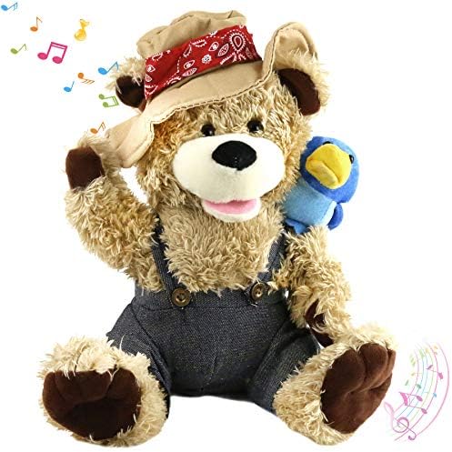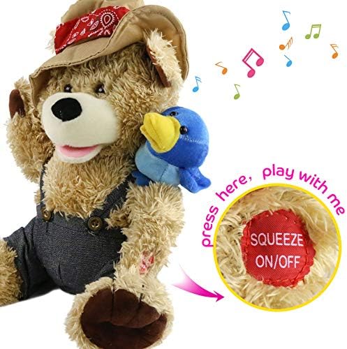 Houwsbaby Singing Teddy Bear Cowboy Stuffed Animal Gift for Kids Boys Girls Electronic Interactive Toy with Plush Pal Friend Blue Bird on His Shoulder Christmas Birthday, 12''