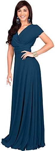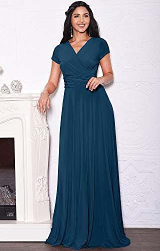 This design features short cap sleeves and the chest crossover neckline. The dress comes with an elastic mid-waist and a generous empire waist, giving the dress a lovely flowing skirt. It is very popular with weddings as a bridesmaid dress, mother of the bride or mother of the groom dress and also some customers have used the white or ivory color as an understated wedding dress. These versatile maxi dresses are available in many sizes, it really does make a wonderful plus size maxi dress.