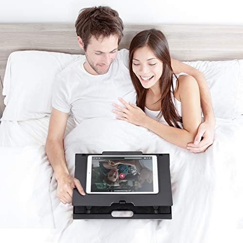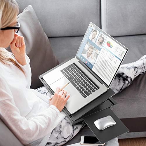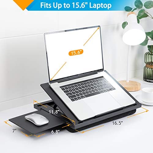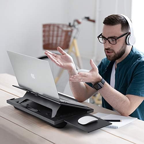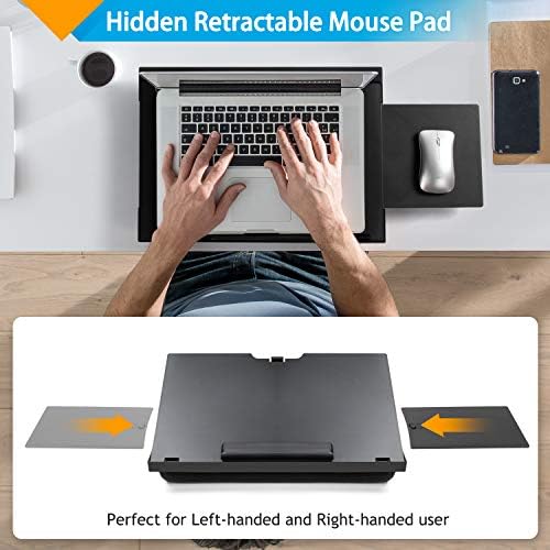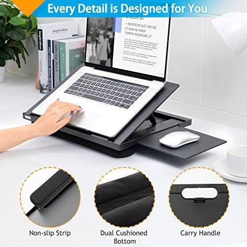 Product Description Best Value Office & Home Solution LORYERGO - LELD11 Adjustable Lap Desk - Designed For A Simple Life This adjustable lap desk brings you a comfortable experience. Whether you want to read, draw or write on the sofa & bed, this laptop desk can meet all your different needs. The 6 adjustable angles can also provide you with an ergonomic viewing angle without having to tire your neck, shoulders, and back. The size of the laptop desk is 16.5 x 11.8 inches, fits up to 15.6 inch laptops, and its smooth surface is perfect for your laptop/tablet/magazine/books. Portable handle is convenient for you to take to travel & business, and the dual soft cushions can provide a comfortable experience for your lap during the journey. SPECIAL DESIGN 1.Retractable mouse pad The detachable mouse pad can not only be stored under the work surface, but also can be freely attached on both sides of the laptop desk to meet the habits of left-handed and right-handed users 2.Non-slip strip The raised stopper prevents your laptop slipping from the lap desk and protects your device from being broken. Helps you to focus more on your work3.Dual soft cushionsThis laptop desk comes with dual soft cushions to provide a comfortable experience for your lap. Makes it easier for you to work, write & draw4.Carry handle The lightweight and compact design makes the lap desk easy to carry anywhere. You can take it with you in the car, on the train, even on the planeSPECIFICATIONS: Color: Black Sizes: 16.5 x 11.8 inches