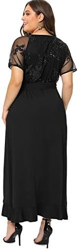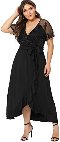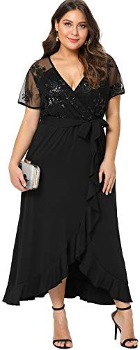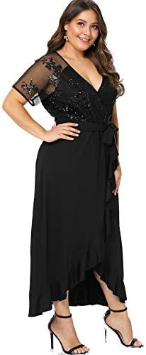Feature: surplice v neck or wrap v neck, floral print or sequin, a line, ruffle hem, asymmetrical, belted, high waist