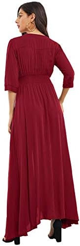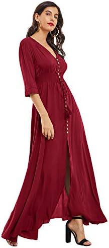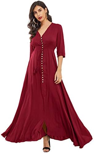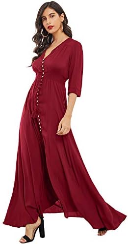 Button Up V Neck Half Sleeve Split Flowy Plain Party Maxi Dress