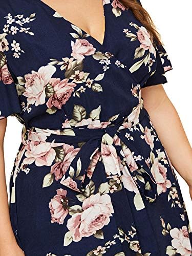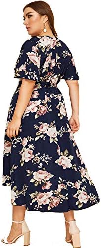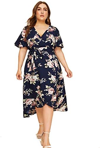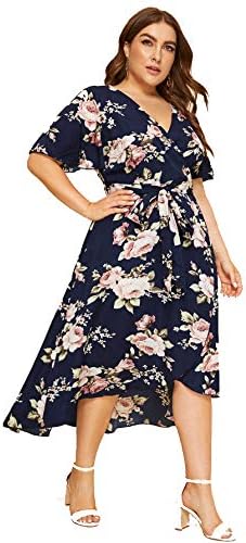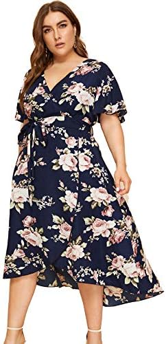 Feature: surplice v neck or wrap v neck, floral print or sequin, a line, ruffle hem, asymmetrical, belted, high waist