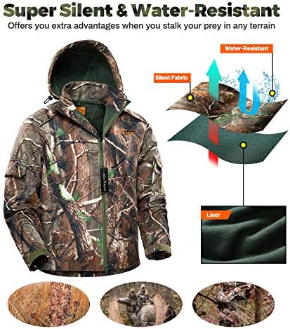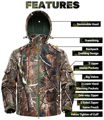 CAMOUFLAGE: Designed our hunting parka pattern based on nature,extremely realistic depiction of various items of vegetation. Camouflage print, Shark skin soft shell fabric,Very marked depth effect between the design's foreground and background, lets you blend in the Natural Gear .