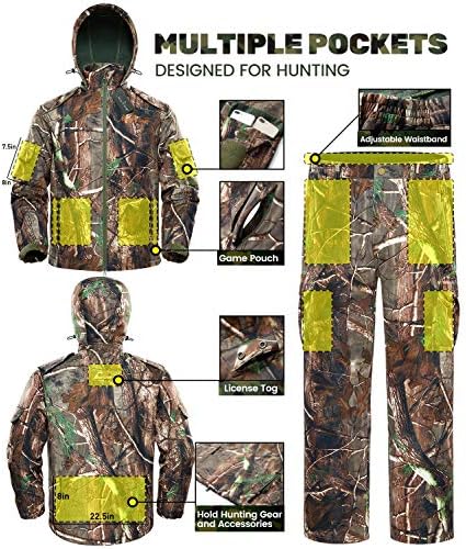 LOTS OF POCKETS: Hunting suit have 10 pockets,2 high chest pockets,3 sleeve pockets,1 split-kangaroo pocket,4 pockets for pants;4 interior cord openings;2 D-ring tabs,2 pen pockets/slots.The pockets allow to store all essential survival items.