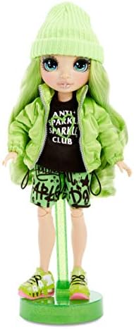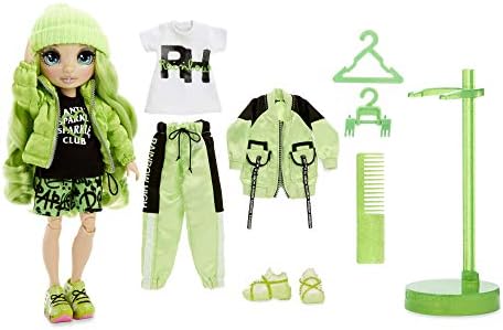 Collect the Rainbow of beautiful fashion dolls with Rainbow High. Introducing Jade Hunter. She's dressed in green from head to toe, and she has gorgeous features, long eyelashes and beautiful, brushable hair. She's fully articulated and posable. Her arms and legs bend, so she can strike tons of glamorous poses. Jade comes with 2 complete outfits to mix and match for bold, showstopping looks. She has an edgy, original look that always stands out. She comes with a puffy jacket, two tees, graffiti shorts, satin tracksuit, sneakers and more. Also includes hair comb, two hangers and a doll stand. PRO TIP: When first unboxing doll, wash her hair thoroughly to remove styling gel and let hair dry completely. Then, her hair is ready to brush. Collect all 6 – Ruby Anderson, Poppy Rowan, Sunny Madison, Jade Hunter, Skyler Bradshaw & Violet Willow