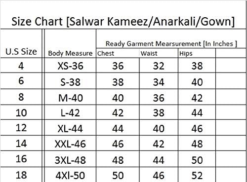 SIZE CHART GUIDE :- The measurements in above Size Chart are considered as body measurements. The ready garment size will be 1-2 inches bigger than body measurements mentioned in the chart. The Ready Garment Size at Bust for all the above sizes in inches will be as following, (XS-36); (S-38); (M-40);( L-42);( XL-44); (XXL-46);