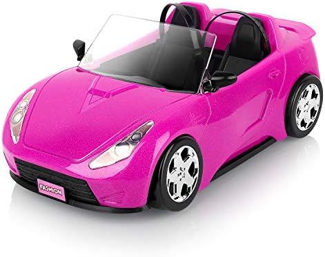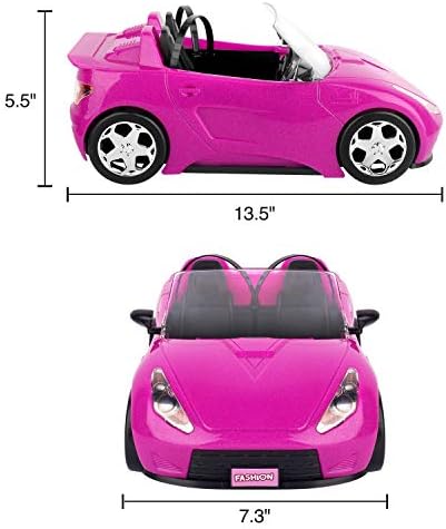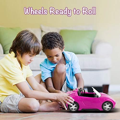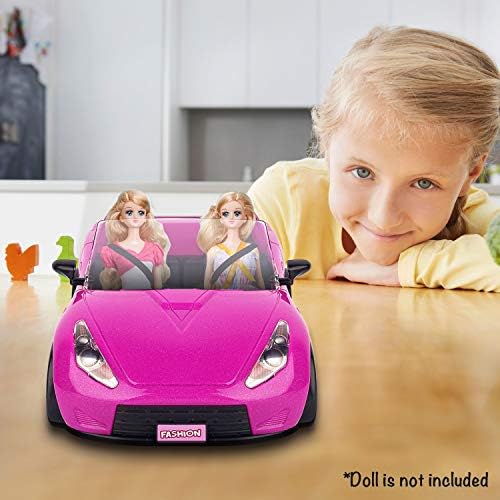 ❤TRENDY CAR FOR DOLLS: The sparkly magenta exterior, modern black interior, open roof, silvery rims and decals headlights make this convertible car pretty stylish.