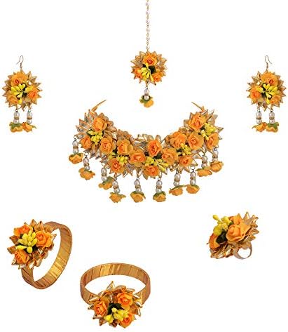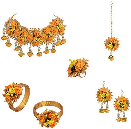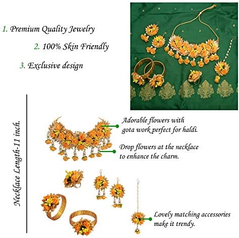 Fabulous Design Haldi Flower Jewellery Set from Zephyrr. Handmade Jewelry set crafted with yellow fabric flowers along with golden gota work make gorgeous. Also you can see cream pearl beads, yellow beads work. Occasion : for lady sangeet,haldi,mehandi,baby shower ,godh bharai , kitty party. Total necklace length-11 inch, Earrings length- 4 inch, Maang Tika Length- 7.5 inch, Bangle Size- 2.7 inch, Adjustable finger ring. Please leave a review if you like our products.It will boost our confidence & help us serve you better. Quality: All Zephyrr products are proudly made in India with finest quality material, be it contemporary metal, chic crystal or boho style stone. We trust our products and will never sell anything that we won't use ourselves.
