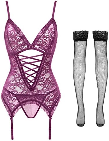 Anyou Womens Lingerie Stretchy Lace Teddy Plus Size Bodysuit Chemise Nightwear with Stockings Size S-XXXXL