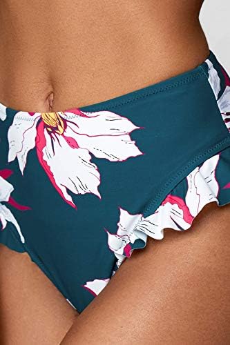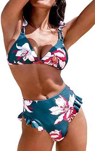 The ruffled bikini top features double adjustable shoulder straps, removable padded cups and the matching high waisted bottom has ruffles design at the side.