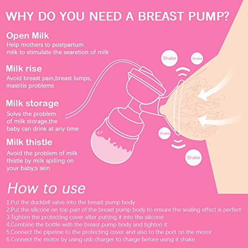 Convenient and Portable - Necessary pacifier is included, so the milk can be fed to the infant as well. Ideal for daily pumping of breast milk. The package includes 1 Breast Pump, 1 Nipple with Lid, 1 USB Cable. Portable and can be flexibly mounted and dismantled.
