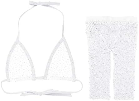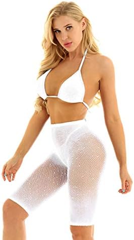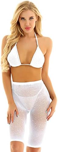 iEFiEL Women Fishnet Swimwear Rhinestone Glitter See Through Clubwear Bikini Top and Shorts Lingerie Beach Cover Up Set