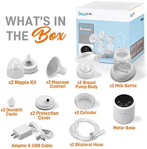 Double Electric Breast Pump - Milk Flowing Stimulating Massage with 9 Expression Levels LCD Back-Lit Display & Anti-back Flow Hygienic Design Features LED Back-Lit Display 5 Stimulation Levels and 9 Expression Levels 2-Phase Expression Technology Stimulation/Expression 4-Phase Smart Functionality Stimulation/Expression/Automatic/Memory Anti-back Flow Design for Hygiene Prevents Infection and Keeps the Milk Fresh Super Soft Silicone Breast Shield Flexible Reduces Pressure and Comfortable to Use Helps Massage the Breast to Optimize Milk Flow Quiet and Lightweight Breast Pump One-Piece Design Easy to Clean and Assemble Smart Touch Screen Technology Compatible with Most Standard Baby Bottles Simple USB ‘Plug-and-Play’ Operation Built-in USB Rechargeable Battery Designed for Moms on the Go who Pump Several Times a Day What's in the Box Pump Machine Charging Cable USB Plug (2) Breastshield (2) Milk Bottle (2) Suction Bowl (2) Connector (2) Valve (2) Tube (2) Cap (2) Dust Cap (2) Bottle Base (2) Bottle Cap Set Technical Specs Power Output 10W Power Supply 120V-240V DC 5V 2A Charging Time 2 Hours Working Time Up to 2 Hours Battery Type Lithium-ion Construction Material PP + ABS + Silicone (BPA-free) USB Cable Length 3 28 ft Model Prolactin Mode Breast Pump Mode Suction 0 04Mpa (max) Bottle capacity 150ml-200ml (about 5-6oz) Product Dimensions 3 05’’ x 3 74’’ -inches Sold as 1 Weight 2 68 lbs