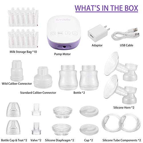 1 X Smibie Pump Motor, 10 X Milk Storage Bag, 2 X Pump Connector, 2 X Duckbill Valve, 1 X USB Adapter & Cable, 2 X 180 ml Feeding Bottle & 2 Cup Nipple, 1 X Wide-caliber connector, 1 X Standard caliber conne, 2 X Silicone horn, 2 X Silicone Diaphragm 2 X Silicone Tube Components