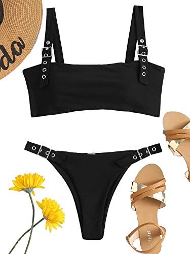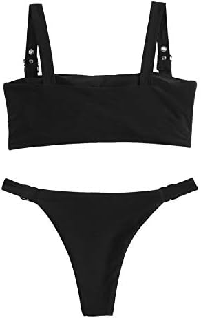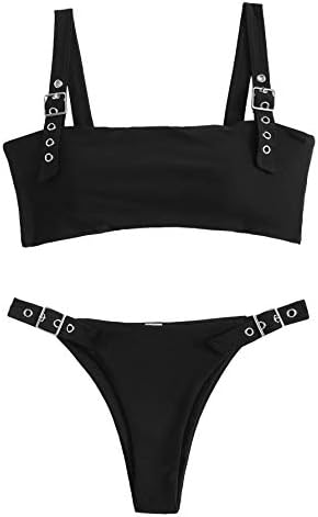 Features: Square neck, wireless, eyelet buckle top, high cut bikini.