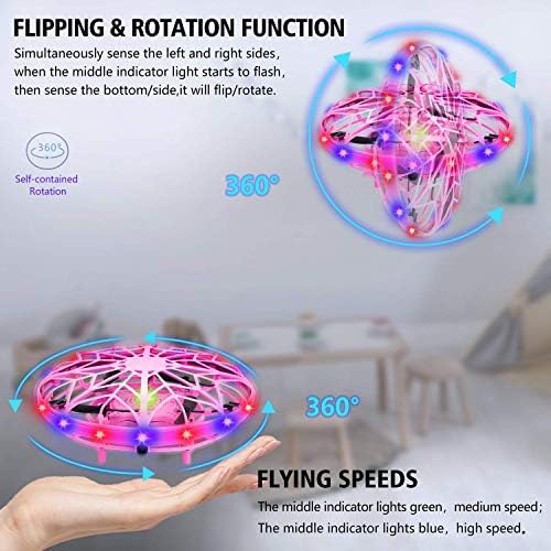 [Sensitive Flying Drone for Kids]: The UFO drone has 5 updated infrared motion sensors, can detect any obstacles around it to prevent hitting and damaging things. You can control it by hand,keeping your kids hours of fun.