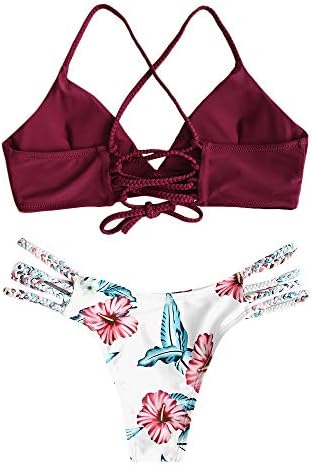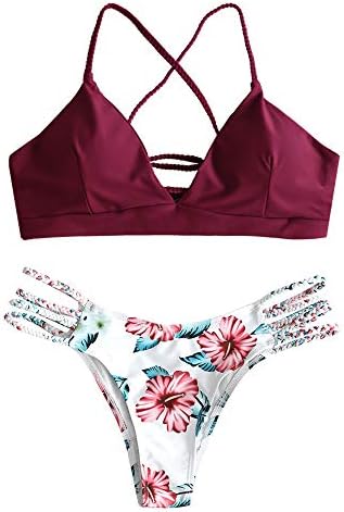 Crossing braided lace-up straps bra top,flowers and braided ladder straps bottoms,wire free,padded cups