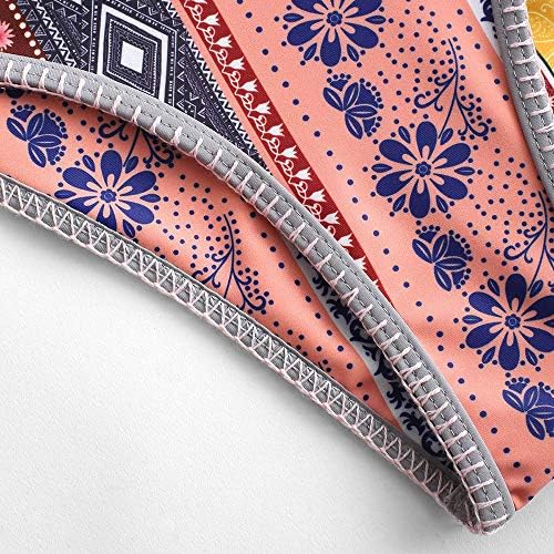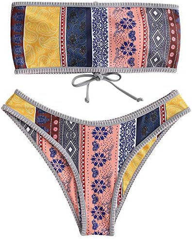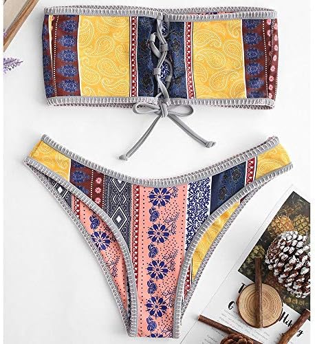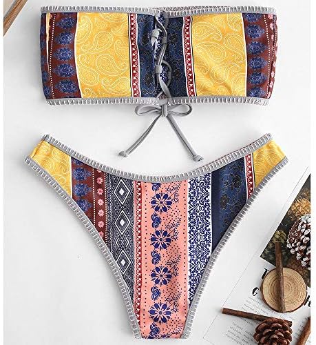 ZAFUL Women's Ethnic Floral Print Lace-Up Bandeau Bikini Set Two Piece Swimsuit