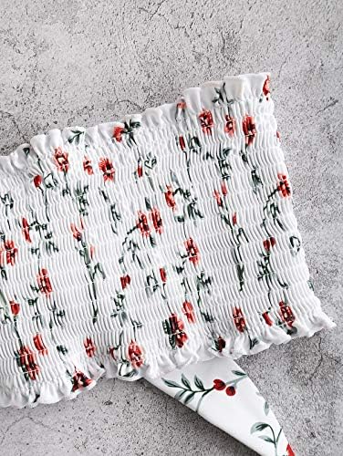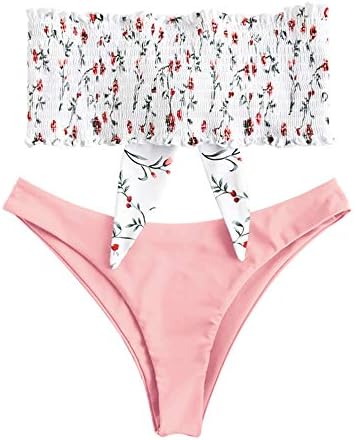 ZAFUL Women's Floral Print Smocked Bikini Set Back Knot Bandeau Strapless Shirred Swimwear