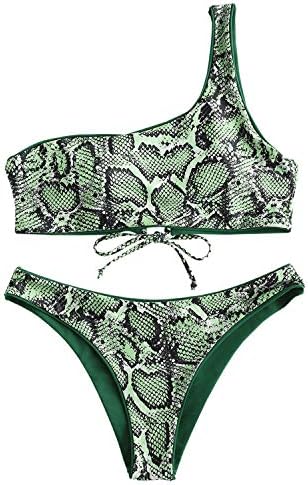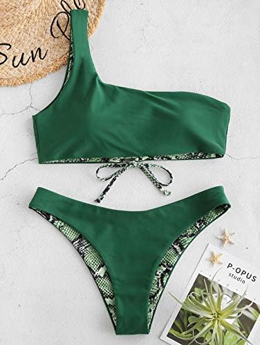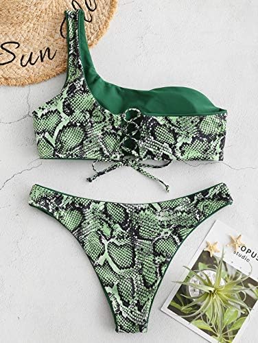 ZAFUL Women's Snakeskin One Shoulder Lace-up Reversible Bikini Set Padded 2 Piece Bathing Suit Swimwear